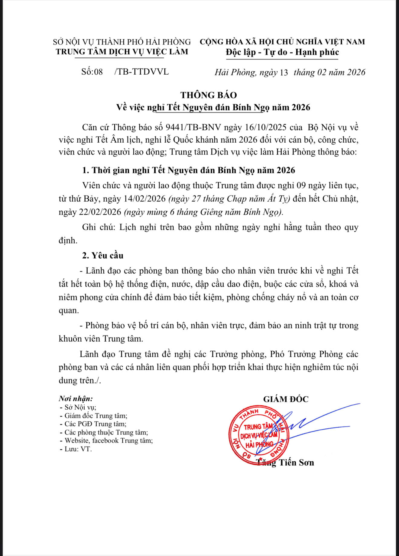 TRUNG TÂM DỊCH VỤ VIỆC LÀM HẢI PHÒNG THÔNG BÁO LỊCH NGHỈ TẾT NGUYÊN ĐÁN 2026